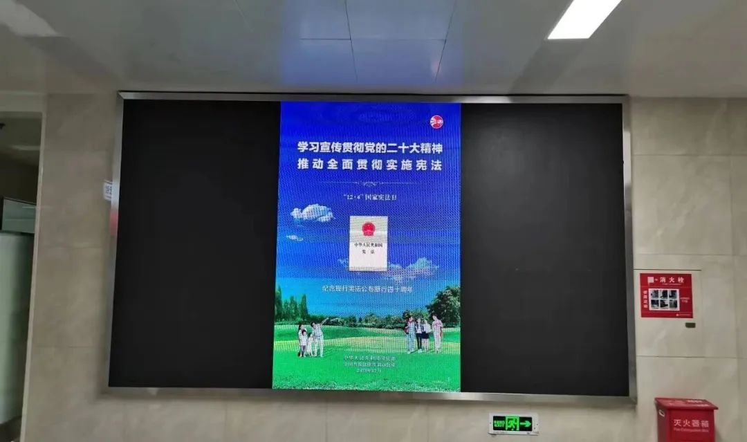 医院在门诊大厅、住院楼大厅利用电子宣传屏滚动播放宪法宣传知识,在院内营造浓厚的学习氛围,让医院职工和就诊病人在进出医院的同时,能多了解一些法律知识,提高大家对宪法法律及地方性法规的知晓度。